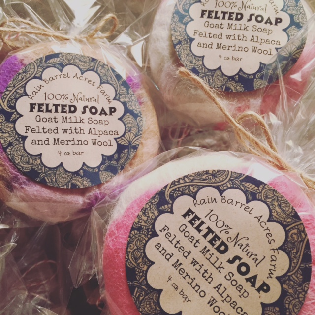 At Rain Barrel Acres we felt our soaps with our Alpaca fleece and merino wool. The alpaca fleece is super soft and the merino is just enough to hold all the felting together. Each felting is unique and makes a beautiful pattern.