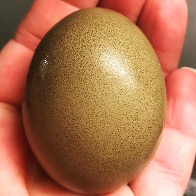 Mutt or no, it really doesn’t matter because their eggs are beautiful. This morning I received my first olive egg from a chicken I raised last year. Pictures really don’t do it justice!